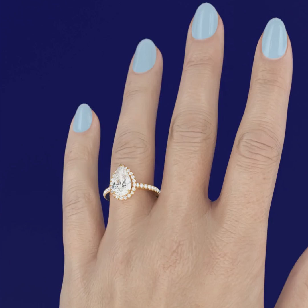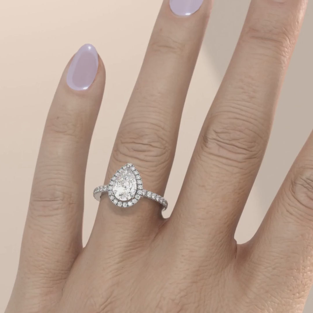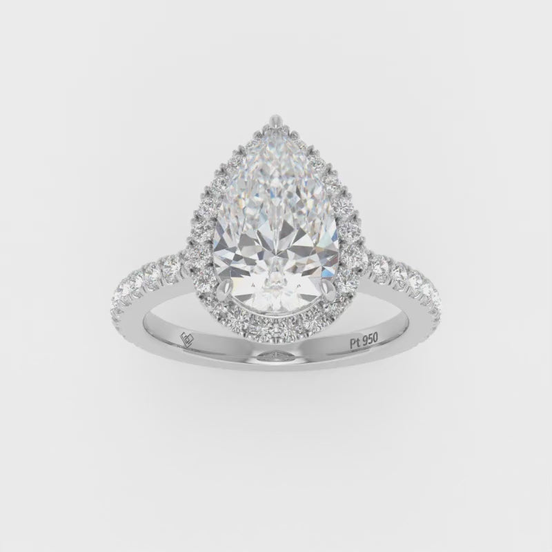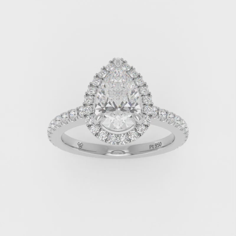 The Bella engagement ring has a lab-grown pear brilliant cut centre diamond surrounded by a timeless diamond halo set on a diamond band. This design is set within a 4 claw platinum or 18k gold band.