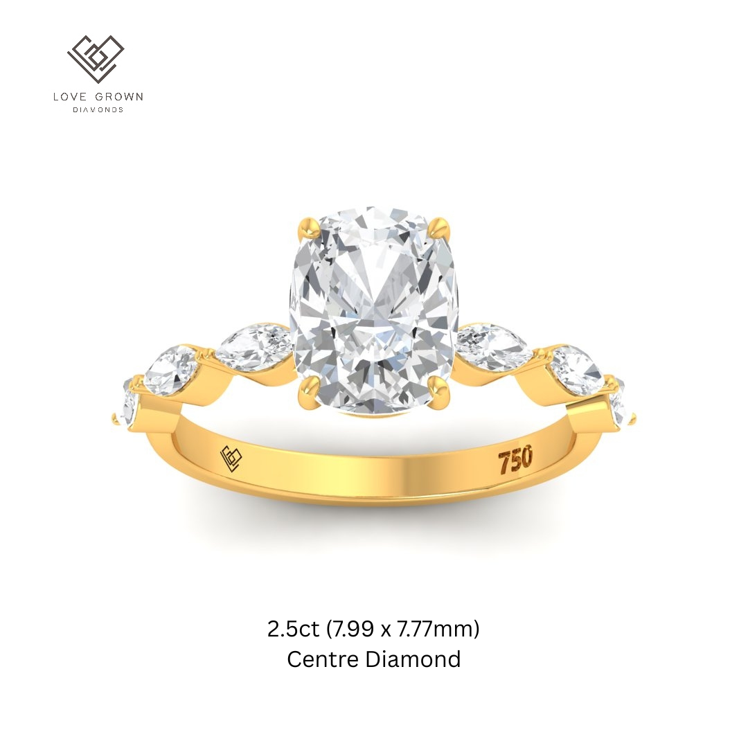 Love Grown Diamonds engagement ring features a cushion cut diamond with two half moon cut side diamonds giving the ring extra brilliance and fire. This design is set within a 4 claw platinum or 18k gold band.