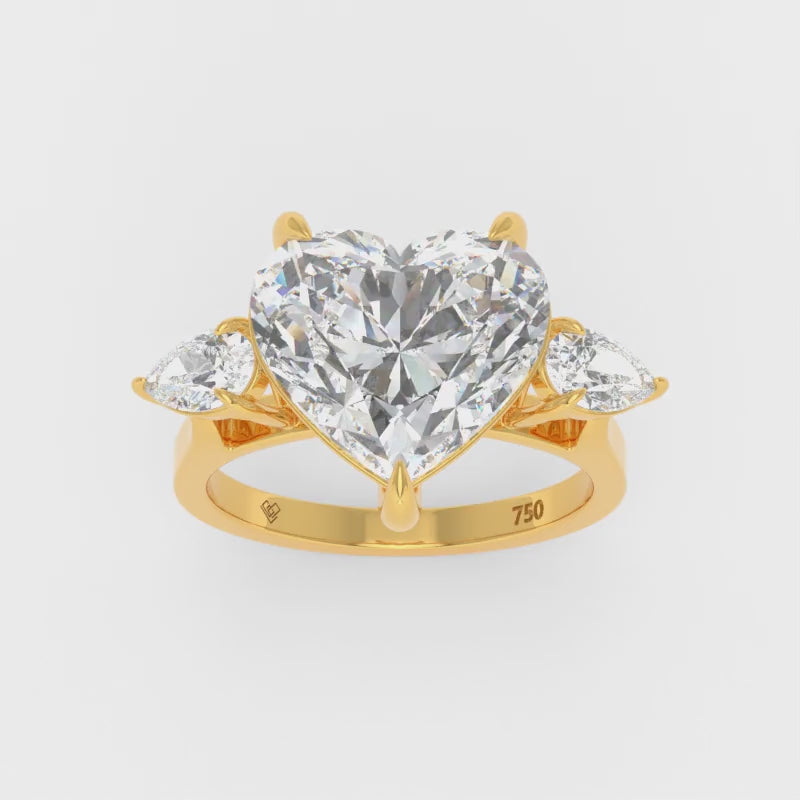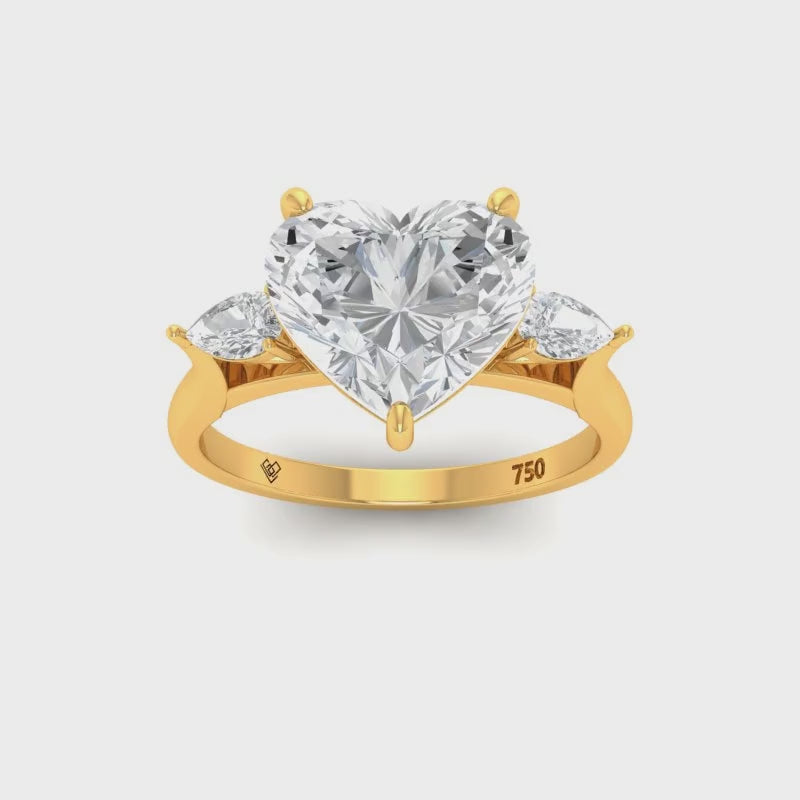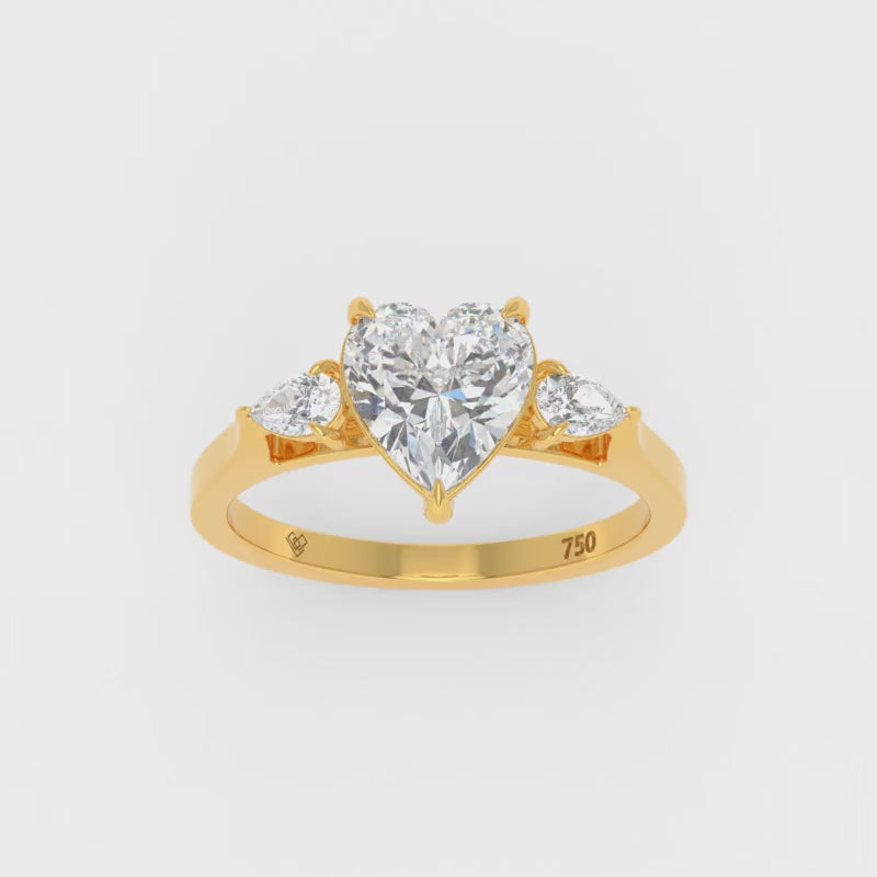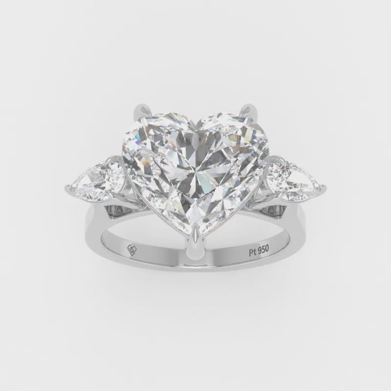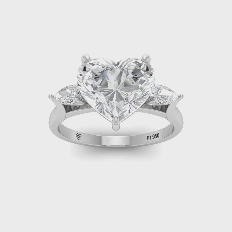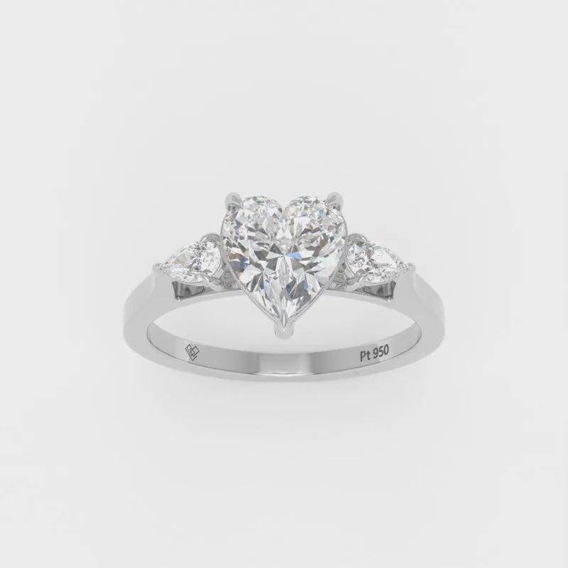 Love Grown Diamonds engagement ring features a heart cut diamond with two pear cut side diamonds giving the ring extra brilliance and fire. This design is set within a 4 claw platinum or 18k gold band.