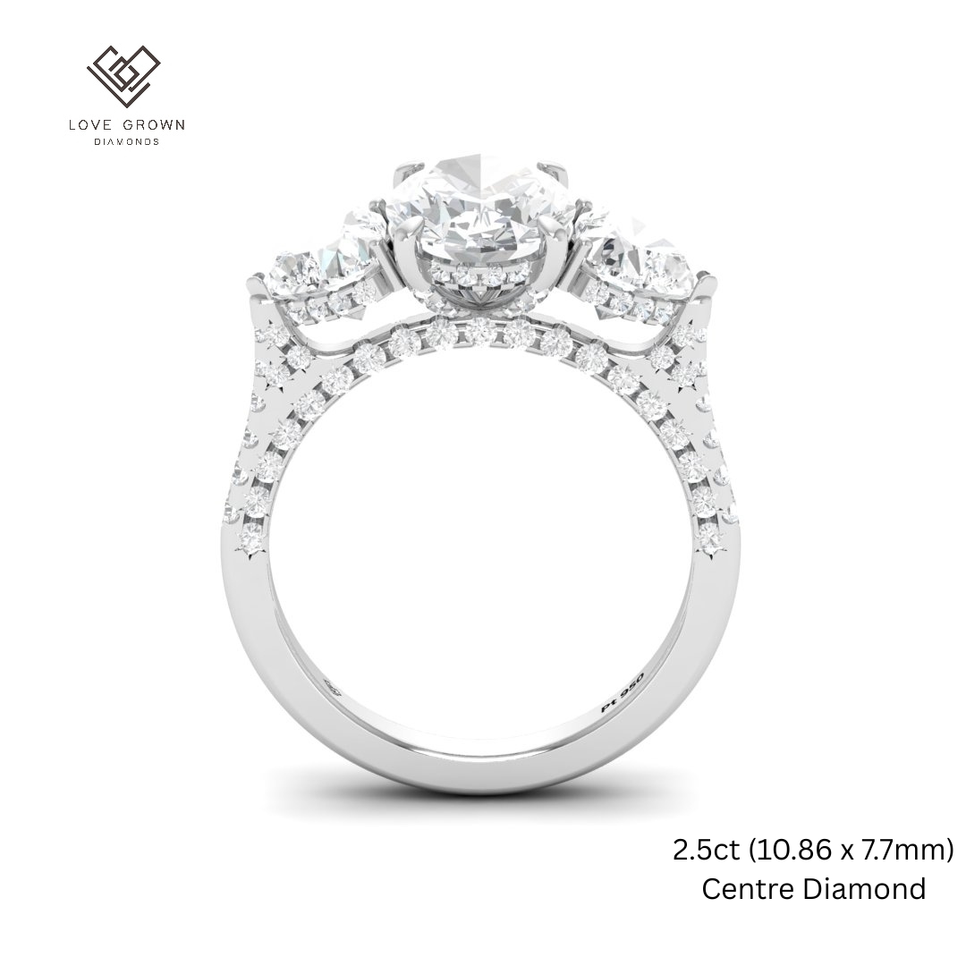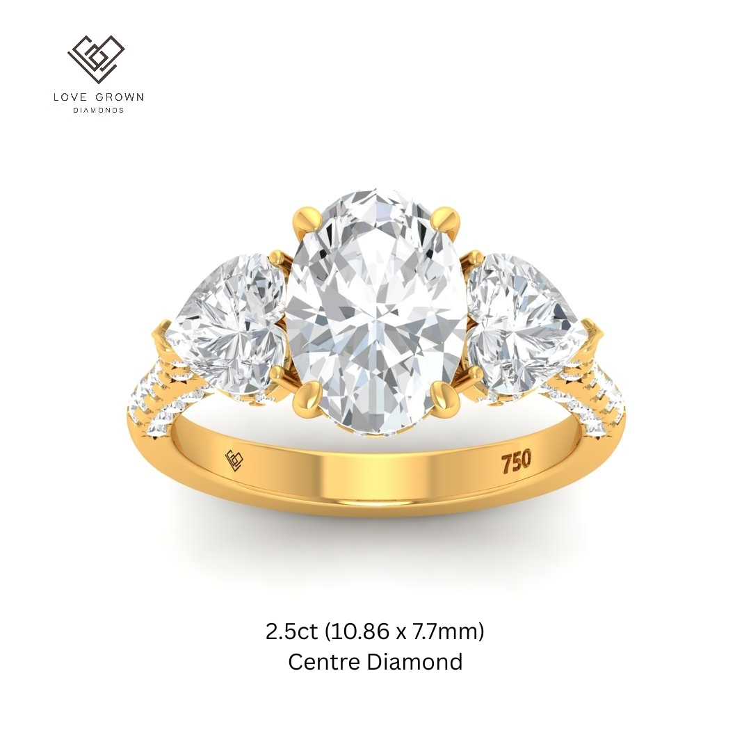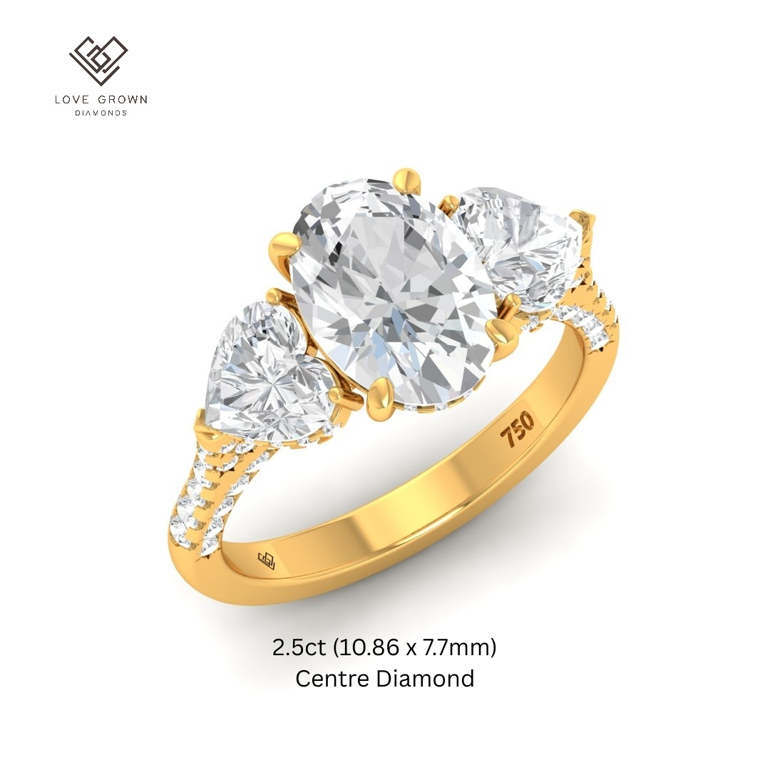 Love Grown Diamonds engagement ring features a oval cut diamond with two heart shaped cut side diamonds and a 3D pave diamond band giving the ring extra brilliance and fire. This design is set within a 4 claw platinum or 18k gold band.