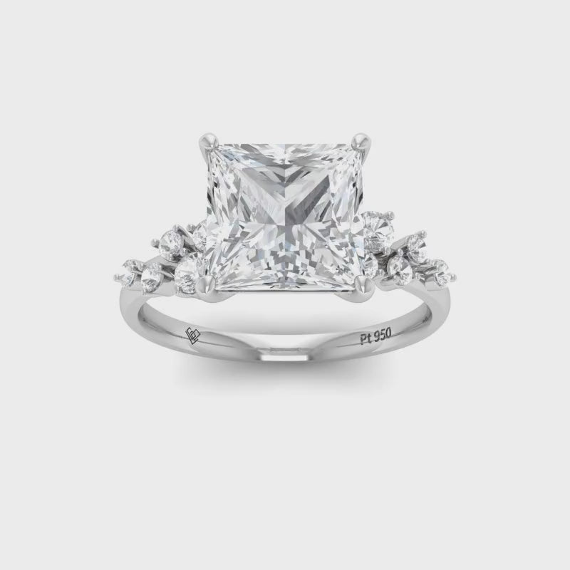 Love Grown Diamonds engagement ring features a princess cut diamond with an accent diamond band giving the ring extra brilliance and fire. This design is set within a 4 claw platinum 18k rose gold, 18k white gold and 18k gold band.