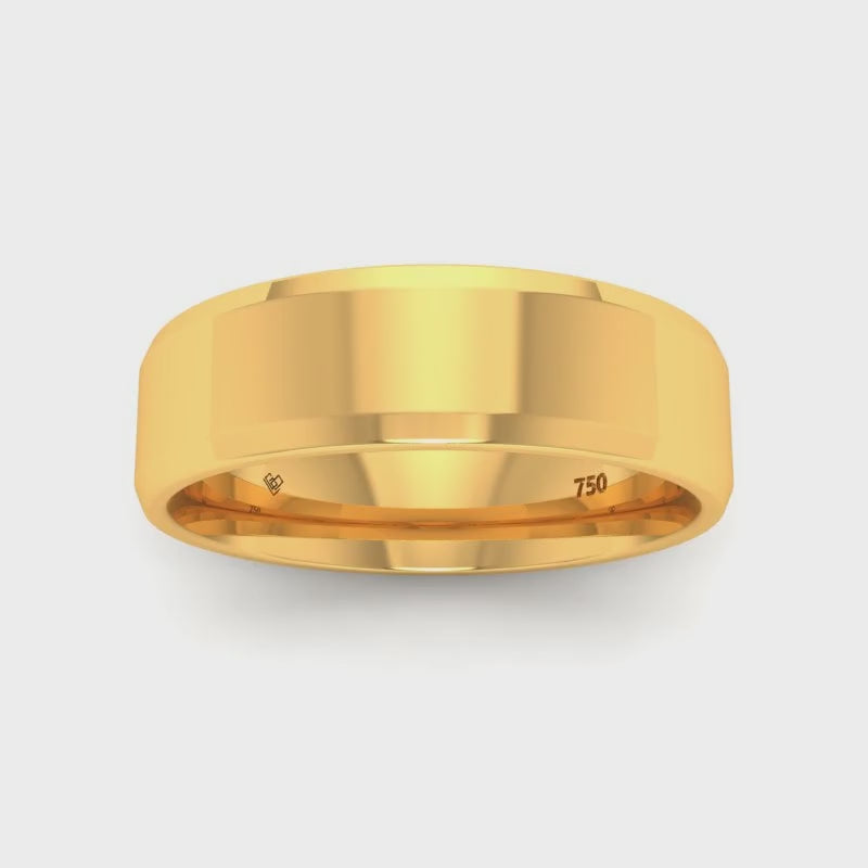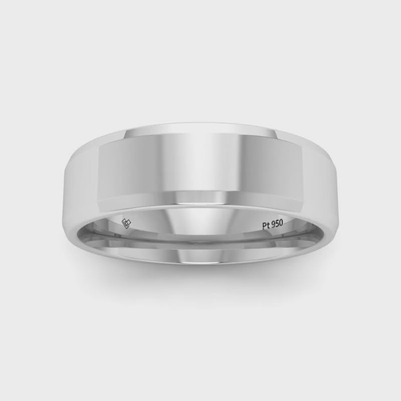Discover the refined elegance of our men's beveled edge wedding band. Expertly crafted, this exquisite piece showcases a contemporary design that pairs sophistication with a rugged edge, perfect for the modern gentleman.