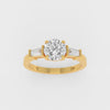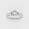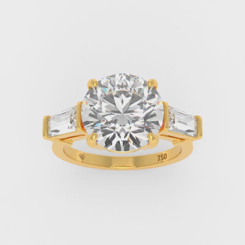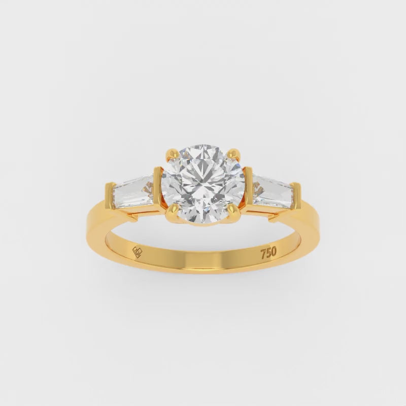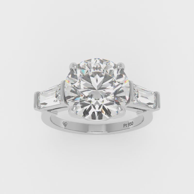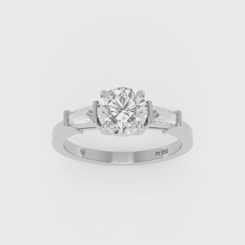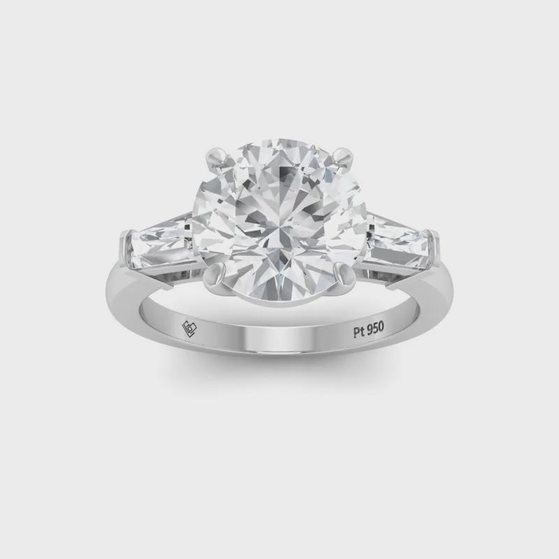 Love Grown Diamonds engagement ring features a round cut diamond with two tapering baguette cut side diamonds giving the ring extra brilliance and fire. This design is set within a 4 claw platinum or 18k gold band.