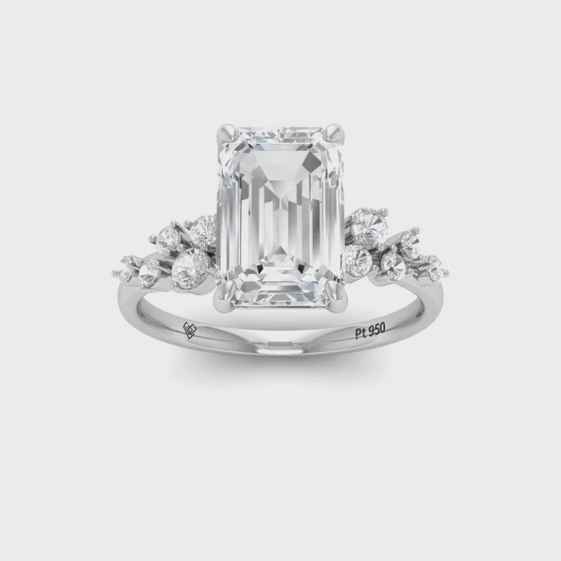 Love Grown Diamonds engagement ring features a emerald cut diamond with an accent diamond band giving the ring extra brilliance and fire. This design is set within a 4 claw platinum or 18k gold band.