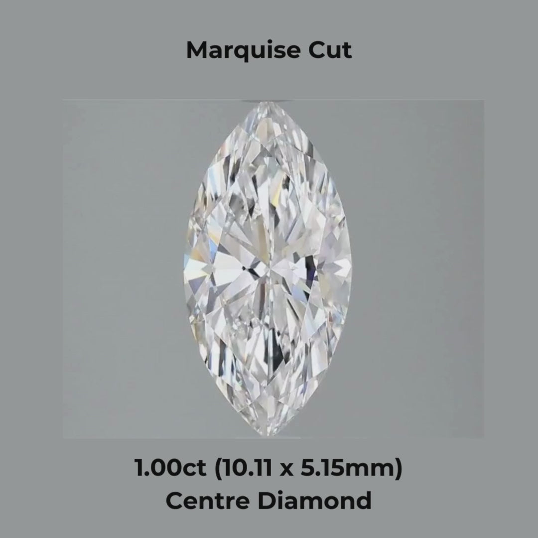 Love Grown Diamonds engagement ring features a marquise cut diamond with side diamonds and a 3D pave diamond band giving the ring extra brilliance and fire. This design is set within a 4 claw platinum or 18k gold band.