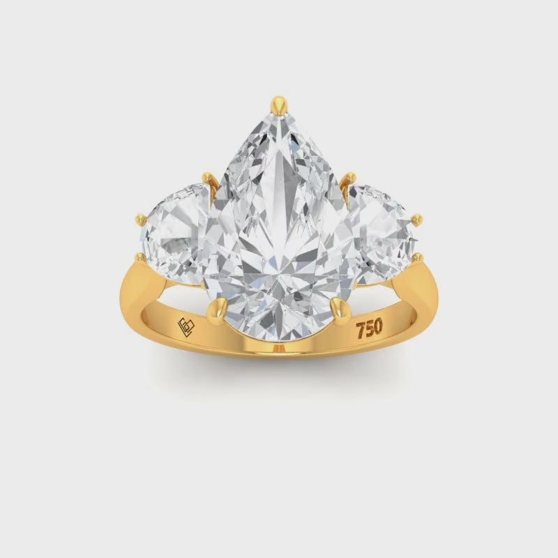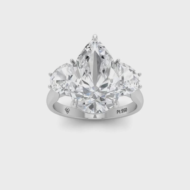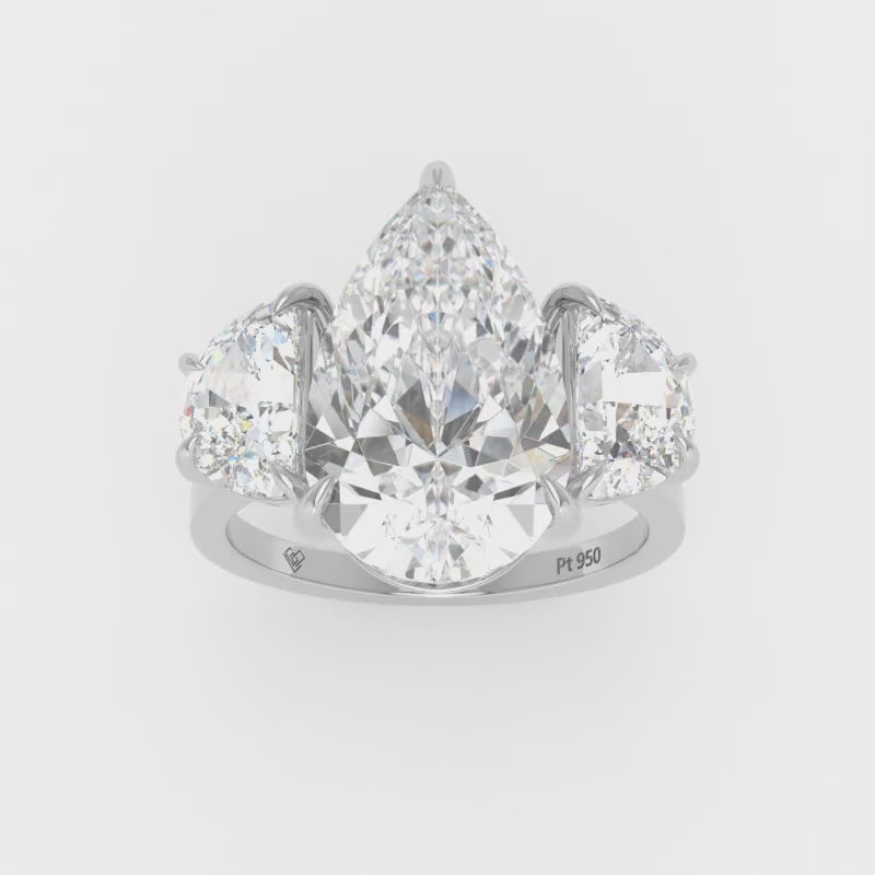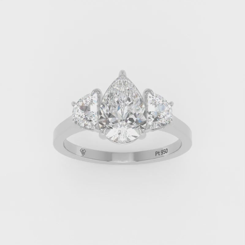 Love Grown Diamonds engagement ring features a pear cut diamond with two half moon cut side diamonds giving the ring extra brilliance and fire. This design is set within a 4 claw platinum or 18k gold band.