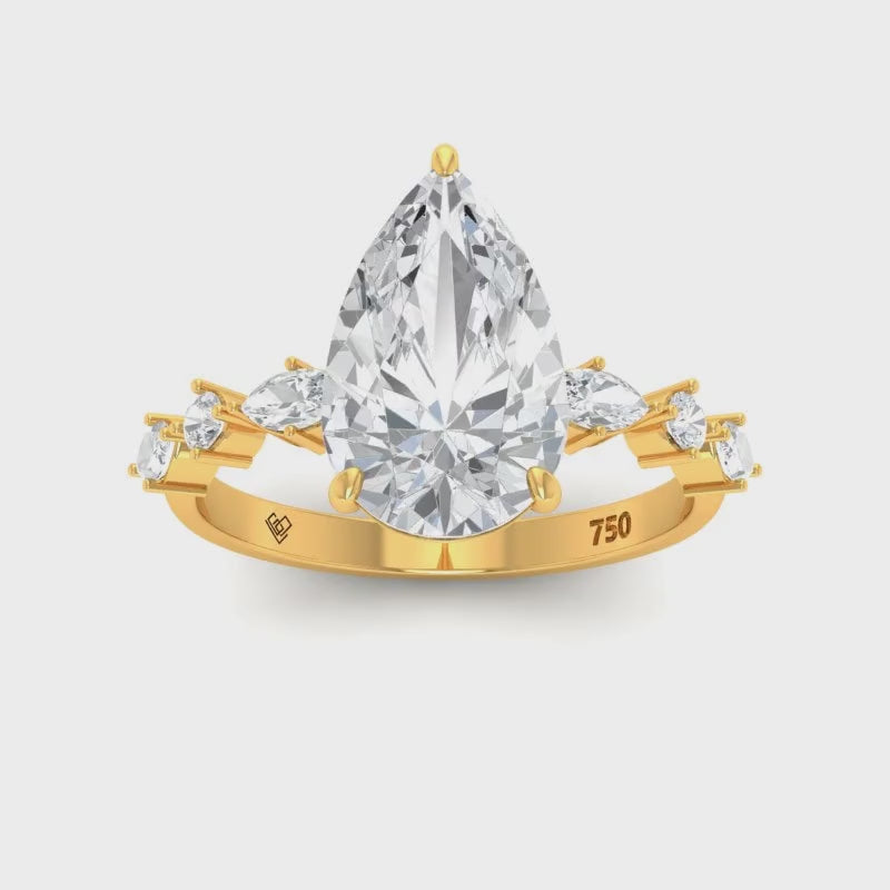 Love Grown Diamonds engagement ring features a pear cut diamond with a diamond band of marquise and round cut diamonds giving the ring extra brilliance and fire. This design is set within a 4 claw platinum or 18k gold band.