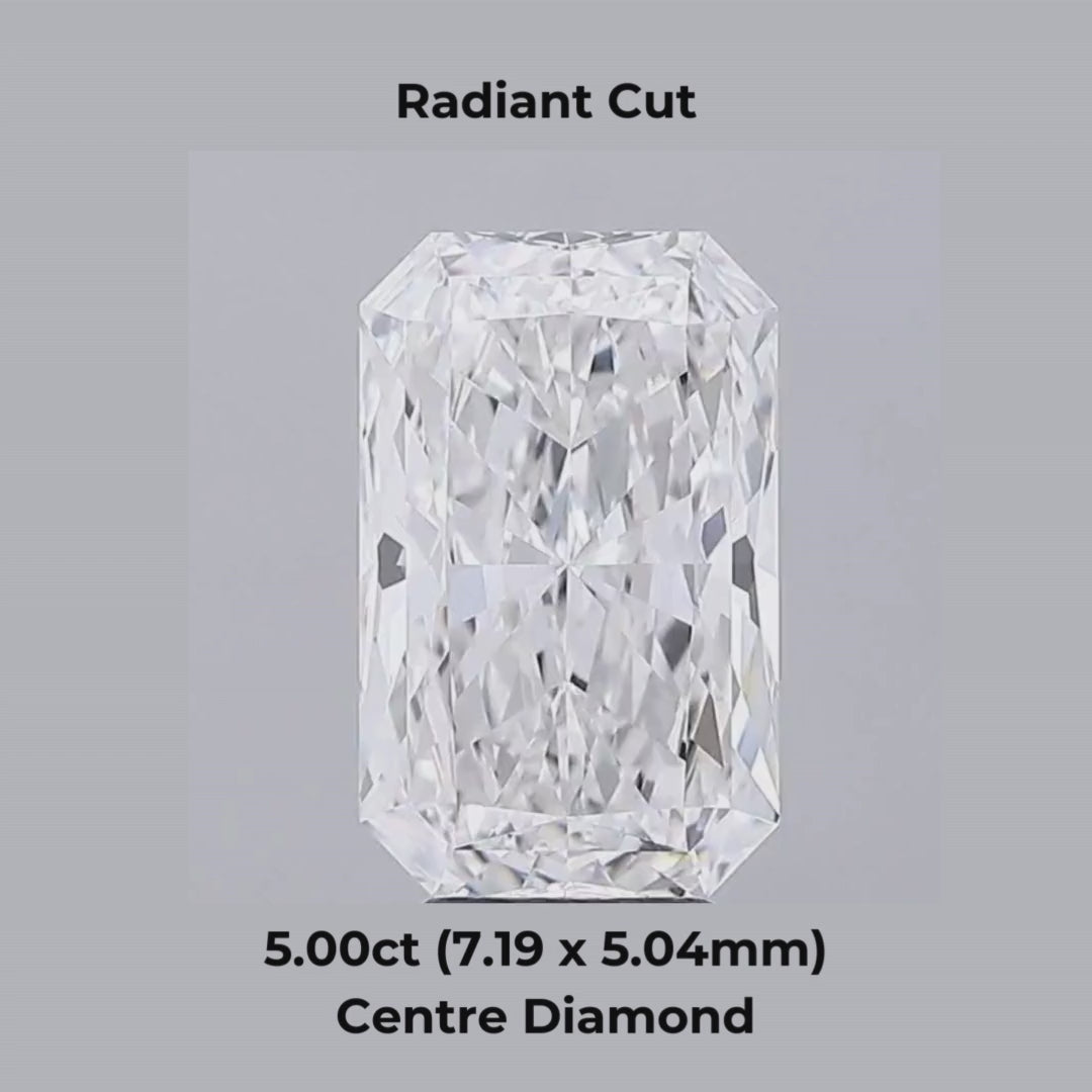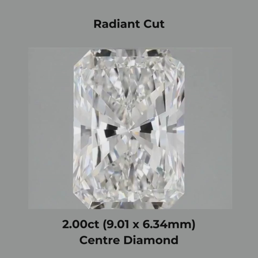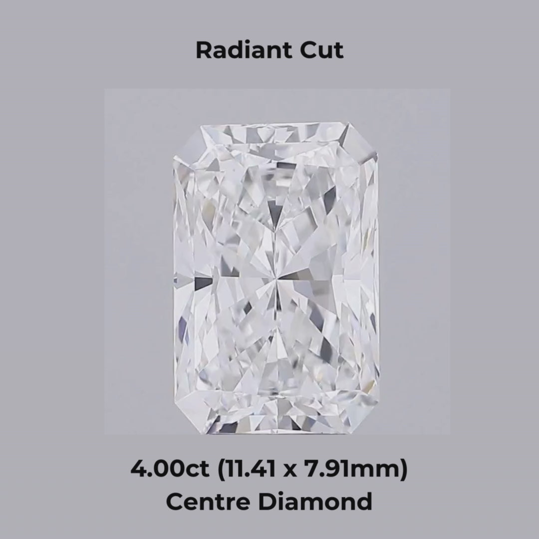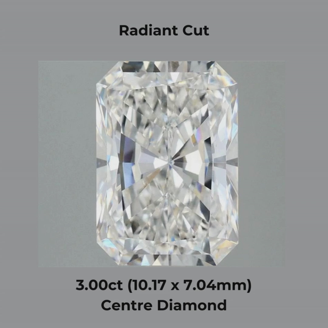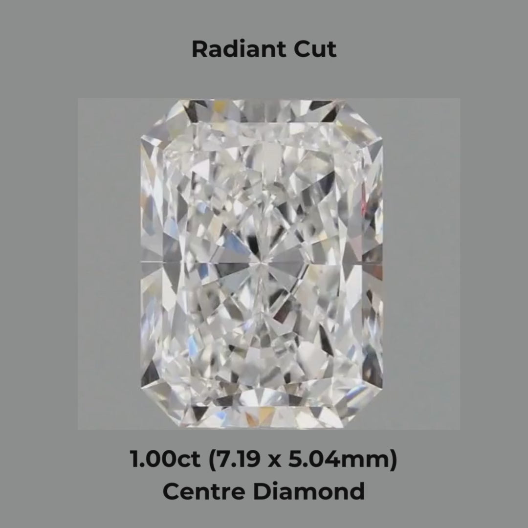 Love Grown Diamonds engagement ring features a radiant cut diamond with side diamonds and a 3D pave diamond band giving the ring extra brilliance and fire. This design is set within a 4 claw platinum or 18k gold band.